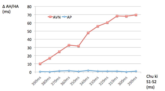 Khoảng S-V/S-A này đối với đường dẫn truyền phụ gần như không thay đổi, ngược lại đối với đường dẫn truyền chính thống, khoảng cách S-V/S-A luôn dài dần ra so với khoảng cách trước đó. Sự thay đổi này của đường dẫn truyền phụ và đường dẫn truyền chính thống duy trì cho đến khi trơ. Kết quả nghiên cứu của chúng tôi cũng phù hợp với nhận xét của một số tác giả nước ngoài.[7]. [8] [9]. [10]. Hệ thống dẫn truyền chính thống (bao gồm nút nhĩ thất – His – Purkinjie) dẫn truyền theo xu hướng dài dần ra rồi trơ không đáp ứng với kích thích nữa (kiểu Decremental) Điều này được giải thích bời hệ thống dẫn truyền là các tế bào cơ tim biệt hoá, chủ yếu được khử cực thông qua các kênh ion Canxi chậm, còn đường dẫn truyền phụ bản chất là các mô cơ, được khử cực thông qua các kênh Natri nhanh