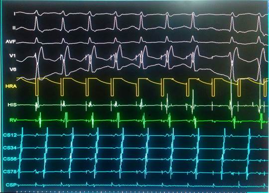Hình 2: Điểm xuất hiện block qua đường dẫn truyền phụ kiểu Mobitz 2 khi kích thích tim với chu kì 260 ms. BN Lương Vũ D. 35T- WPW