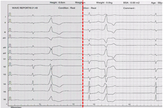 Ở cả hai nhóm Valsalva và ĐRTP, 100% các trường hợp điện tâm đồ có dạng bloc nhánh phải hoàn toàn và trục điện tim quay xuống dưới (QRS dương ở DII, III, aVF). Hình 2: Điện tâm đồ của ngoại tâm thu thất khởi phát từ xoang Valsalva (trái) và đường ra thất phải (phải): QRS có dạng blốc nhánh phải và trục điện tim quay xuống dưới (QRS dương ở D2, D3, aVF). Tuy nhiên, có sự khác nhau về chuyển tiếp phức bộ QRS (trái: trước V3; phải: sau V3).