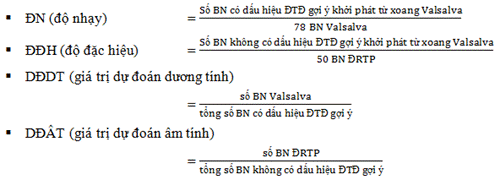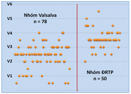 Biểu đồ 3 cho thấy, trung vị chuyển tiếp QRSNTTT-TNT ở nhóm Valsalva xảy ra tại V2V3, trong khi trung vị chuyển tiếp ở nhóm ĐRTP xảy ra tại V3V4. Theo các tác giả [5, 6, 10], TNT-NTTT khởi phát từ xoang Valsalva thường có chuyển tiếp QRS xảy ra tại V1-V3, sớm hơn chuyển tiếp của TNT-NTTT từ đường ra thất phải. Tuy nhiên, khoảng 20% số trường hợp có chuyển tiếp QRS xảy ra sau V3. Điều này được giải thích là do ổ khởi phát nằm trong xoang Valsalva nhưng xung động điện được dẫn truyền “ưu tiên” đến và gây khử cực sớm ở đường ra thất phải [11]. Nếu lấy “lát cắt” về chuyển tiếp QRS để phân biệt giữa 2 nhóm tại Bảng 4: Giá trị của các thông số điện tâm đồ trong chẩn đoán rối loạn nhịp thất là khởi phát từ xoang Valsalva.