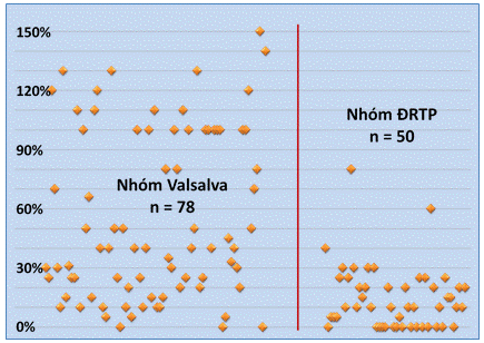 Tất cả các BN nghiên cứu đều có ngoại tâm thu thất. 17,9% số BN ở nhóm Valsalva và 24% số BN ở nhóm ĐRTP có cơn tim nhanh thất. Tỉ lệ nam/nữ ở nhóm Valsalva xấp xỉ 1: 1, trong khi đó tỉ lệ nữ ở nhóm ĐRTP là 80%, sự khác biệt có ý nghĩa thống kê với p Error! Reference source not found. ] Tuổi trung bình không khác biệt giữa 2 nhóm (p > 0,05). Ở nhóm Valsalva: BN nhỏ tuổi nhất là 20, lớn tuổi nhất là 82; Ở nhóm ĐRTP: BN nhỏ tuổi nhất là 17, lớn tuổi nhất là 78. HA tối đa trung bình ở nhóm Valsalva cao hơn nhóm ĐRTP (p Thời gian mắc bệnh trung bình (tính từ khi xuất hiện triệu chứng) không khác biệt ý nghĩa giữa 2 nhóm (p > 0,05). Ở nhóm Valsalva, thời gian mắc bệnh thay đổi từ ngắn nhất là 3 tháng đến dài nhất là 20 năm. Số thuốc chống loạn nhịp đã sử dụng trung bình không khác biệt giữa 2 nhóm (p > 0,05). Ở nhóm Valsalva, 100% BN đã dùng ít nhất 1 thuốc chống loạn nhịp. Thuốc chống loạn nhịp được sử dụng phổ biến nhất là chẹn beta giao cảm (83,3%), tiếp đến là amiodarone (70,5%). Ở nhóm Valsalva, 6/78 BN (7,7%) đã được triệt đốt NTTT ở ĐRTP trước đó nhưng không thành công. Đặc điểm điện tâm đồ Bảng 2: Đặc điểm điện tâm đồ 12 chuyển đạo